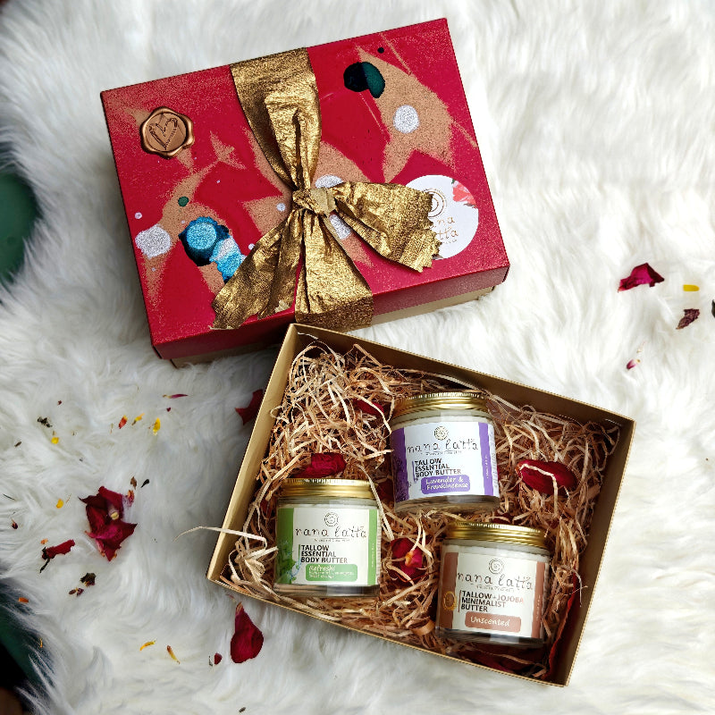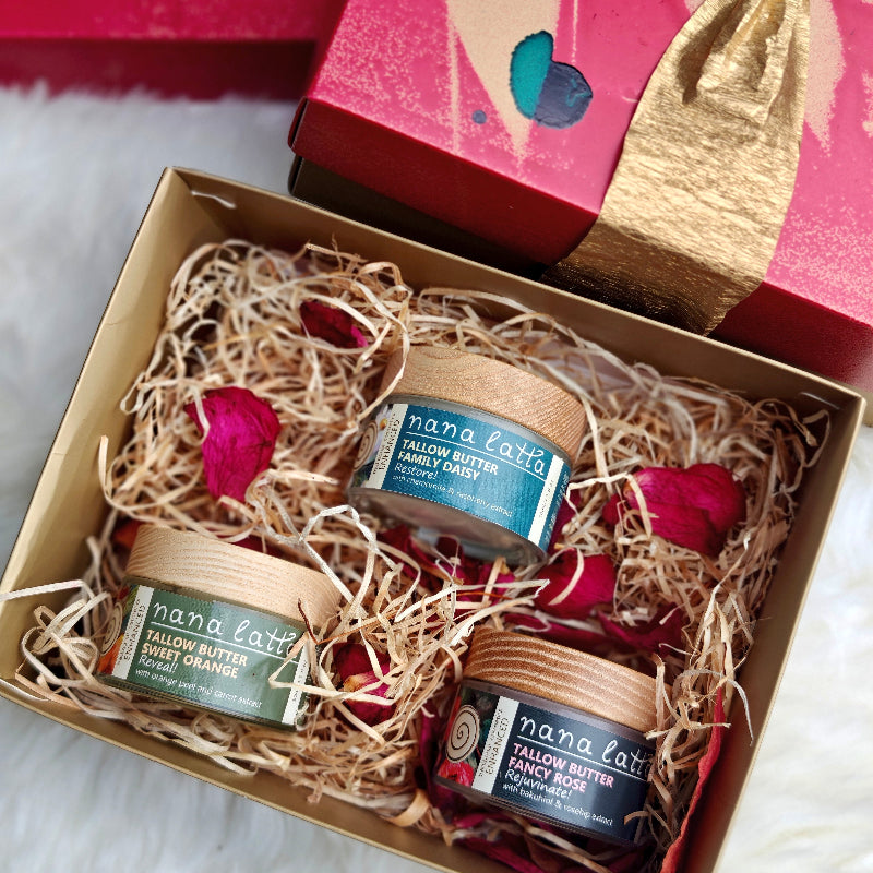 The box comes empty and is perfect for carrying any of our Nana Latta products - from tallow butters to bath salts and gift sets.